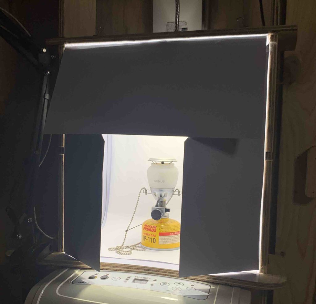 入り口は極力狭くして、上からの60Wの灯りを被写体に反射させてます。